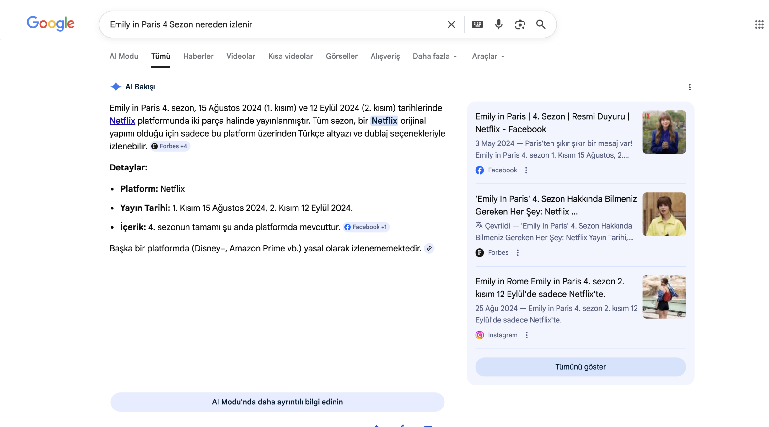 Ayrıca AI Overview içindeki “Çevrildi” ibaresi yer alan Forbes ve aslında pek çok dizi aramasını domine eden ve yasal olmayan web sitelerinin de filtrelendiğini belirtmekte fayda var.