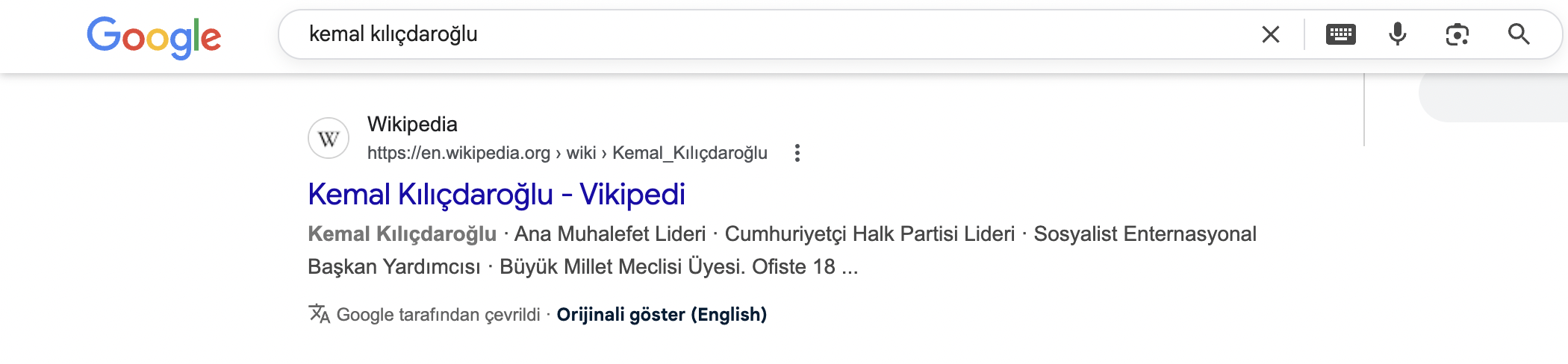4. Kemal Kılıçdaroğlu Örneği: Eski siyasetçi Kemal Kılıçdaroğlu’nu Türkiye’den Türkçe arattığınızda, Google detaylı Türkçe Wikipedia sayfası yerine İngilizce Wikipedia sayfasının proxy çevirisini gösteriyor. Yani yerel içerik mevcut olsa bile, Google kendi proxy sistemini tercih edebiliyor. Yemek tarifleri yayınlayan siteler için durum daha da vahim durumda. Pek çok yabancı tarif tamamen çevrilmiş sonuçlar ile geliyor.