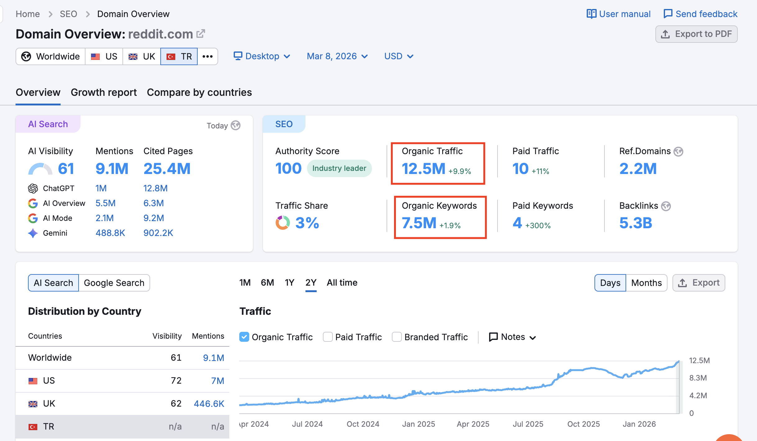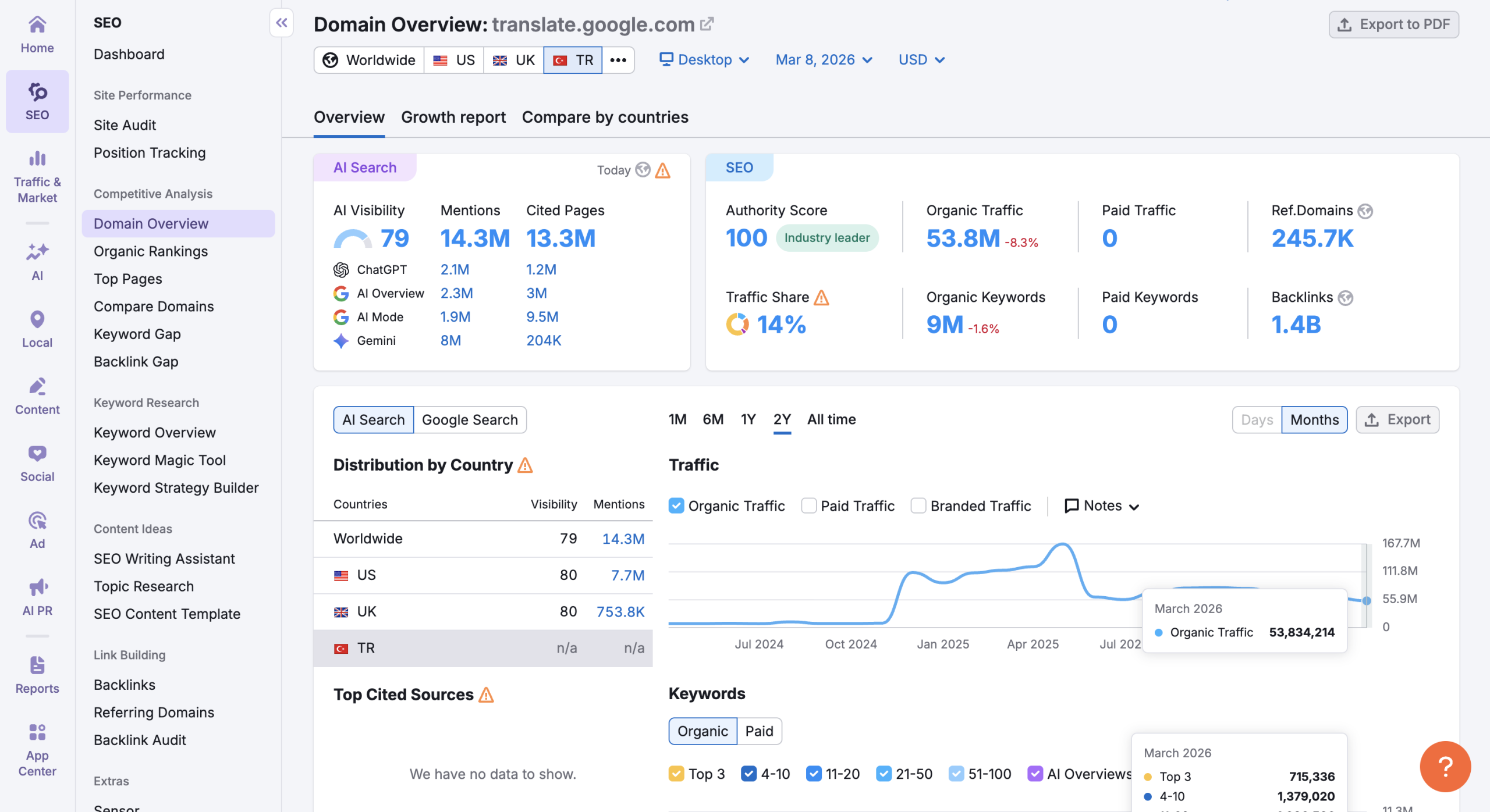 AI Overview kaynak görünürlüğünü takip edin. Artık başarı kriteri yalnızca organik sıralama değil; AI yanıtlarında ne sıklıkla kaynak olarak gösterildiğiniz (Share of Voice) ön plana çıkıyor.